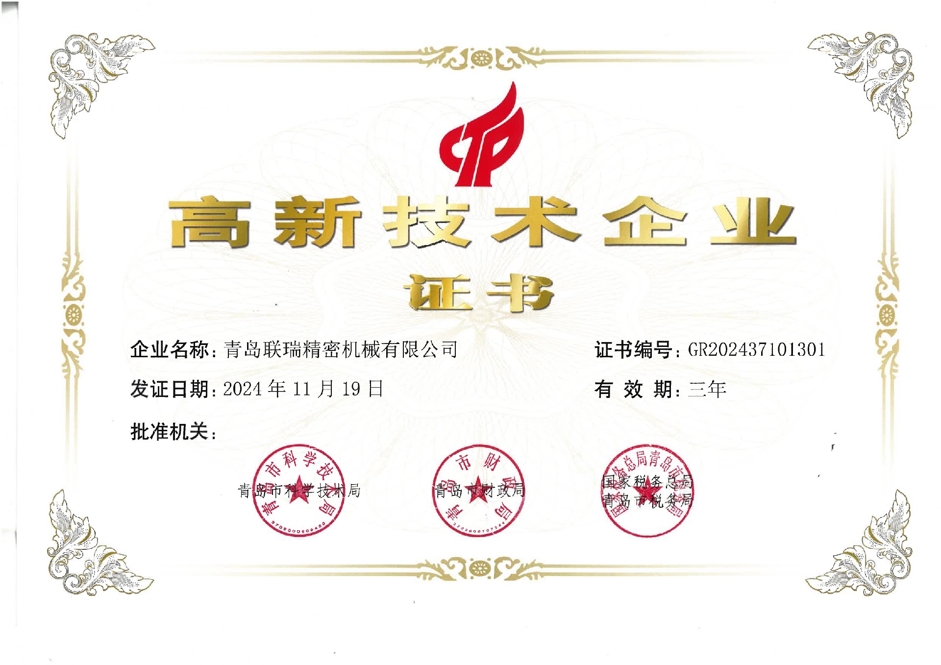 通过高新技术企业资格认定并取得证书;