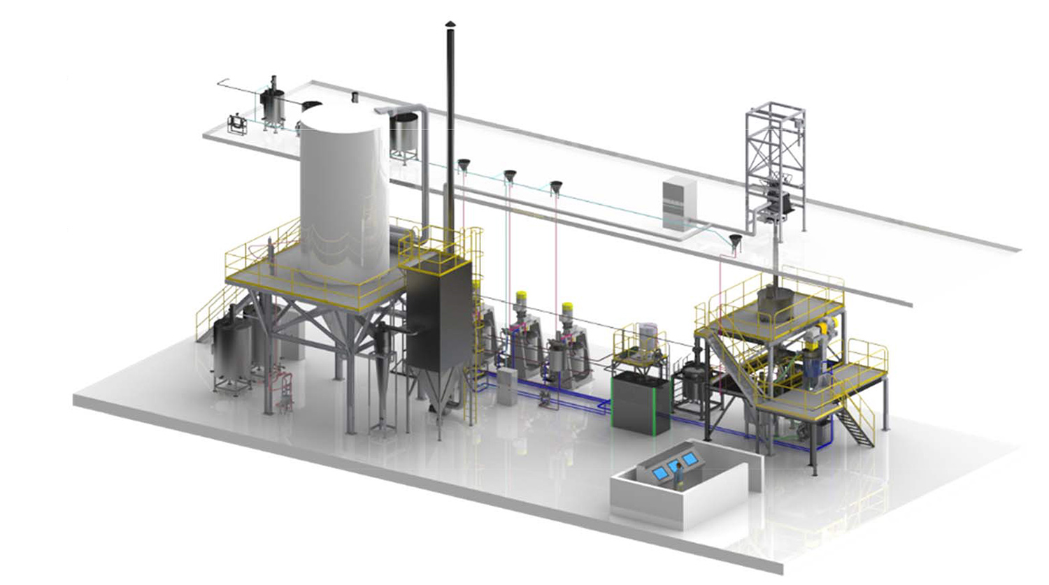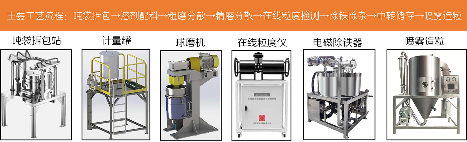 氧化铝智能生产线满足整个过程中全封闭、自动化、数字化、智能化生产,实现配料精确、质量稳定、集中控制,连续生产的要求,所有参与物料循环的设备及零部件经过ETFE涂层处理,可防止物料污染。产线主要设备及系统配置主要有吨袋拆包一体机、溶胶搅挫系统、粉料配料输送系统、称重缓存系统,UP高端球磨机、在线粒度检测、除铁除磁系统、喷雾造粒系统,除尘过滤系统、安全监控系统等。根据客户需求,可配置不同UP高端球磨机,实现满足于微米级至纳米级物料生产。